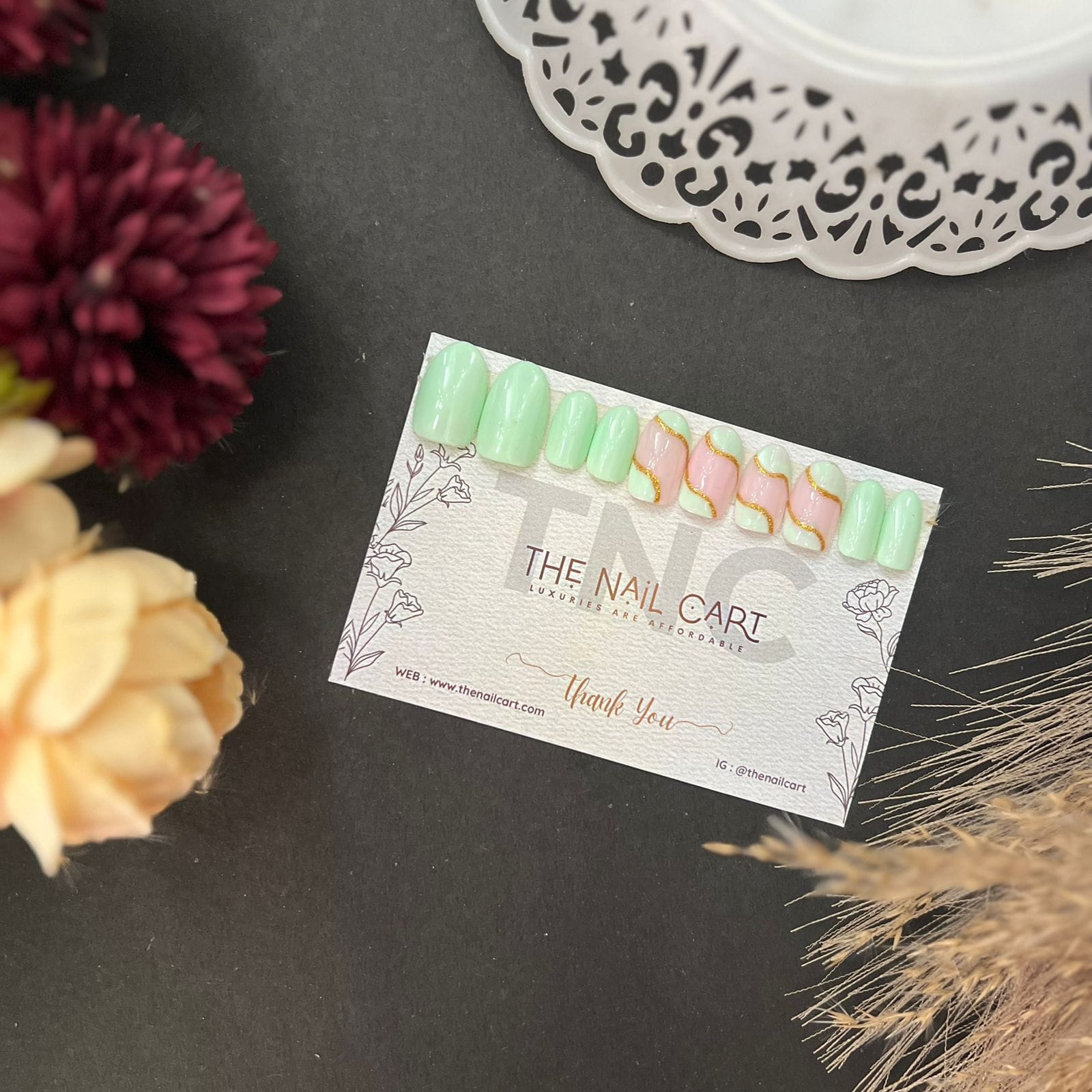 Elevate your nail aesthetics with our Green with Swirl – TNC Press-On Nails, designed for the bold & elegant women. The subtle Green base with golden swirls detailing gives a sleek, modern edge perfect for both everyday chic and special occasions.